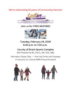 Join us for FREE SKATING. We are celebrating 25 years of service. Contact Brant will have an information display table, provide free hot drinks and giveaways, and a chance to win a family raffle prize at the event!