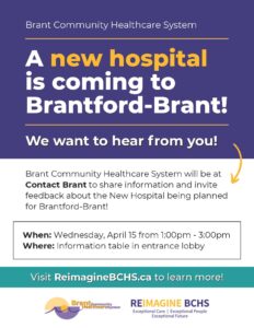 A new hospital is coming to Brantford-Brant! Brant Community Healthcare System will be atContact Brant to share information with the community and invitefeedback about the new hospital being plannedfor Brantford-Brant.